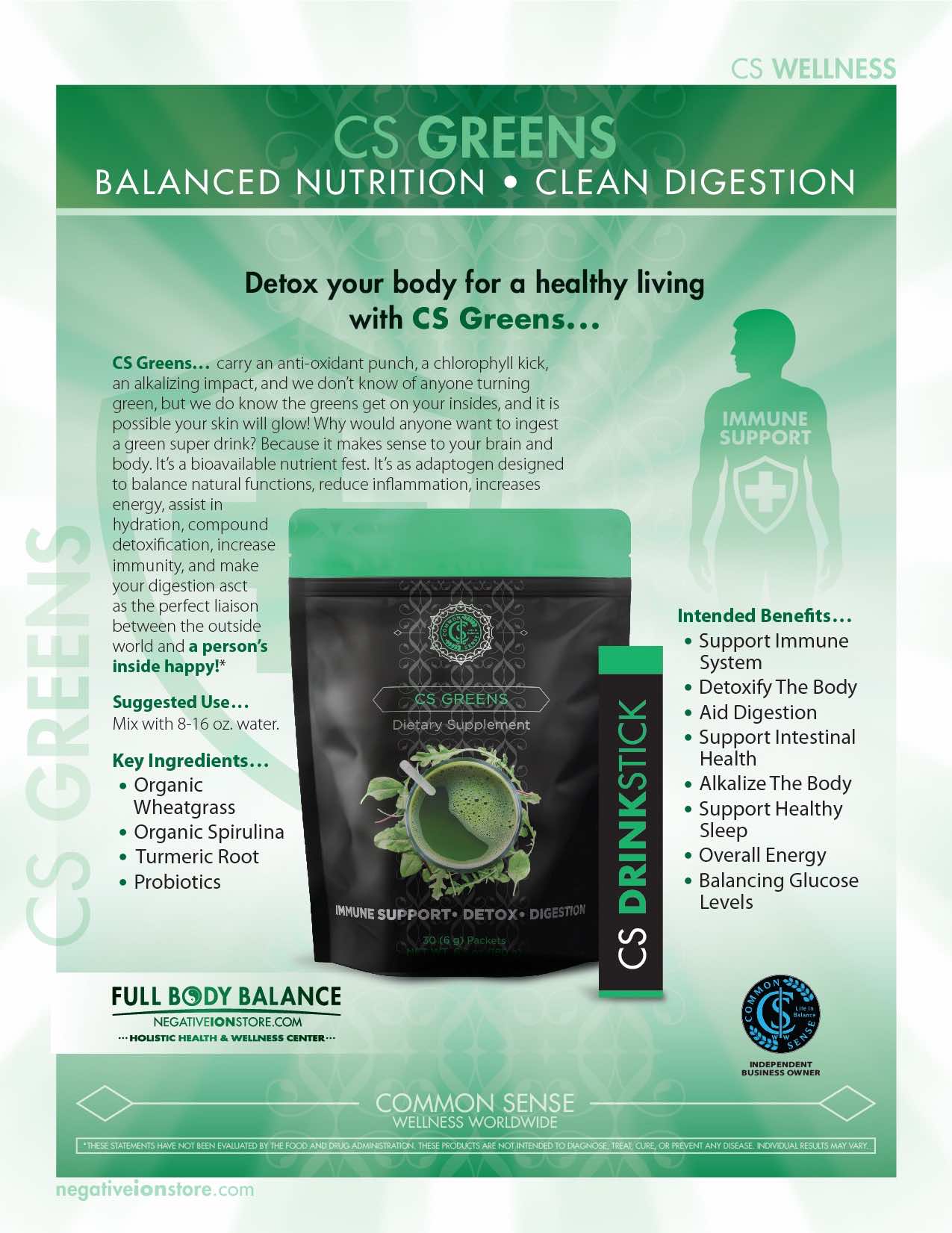 CS Greens carry an anti-oxidant punch, a chlorophyll kick, an alkalizing impact, and we don’t know of anyone turning green, but we do know the greens get on your insides, and it is possible your skin will glow! Why would anyone want to ingest a green super drink? Because it makes sense to your brain and body. It’s a bioavailable nutrient fest. It’s an adaptogen designed to balance natural functions, reduce inflammation, increases energy, assist in hydration, compound detoxification, increase immunity, and make your digestion act as the perfect liaison between the outside world and a person’s inside happy!