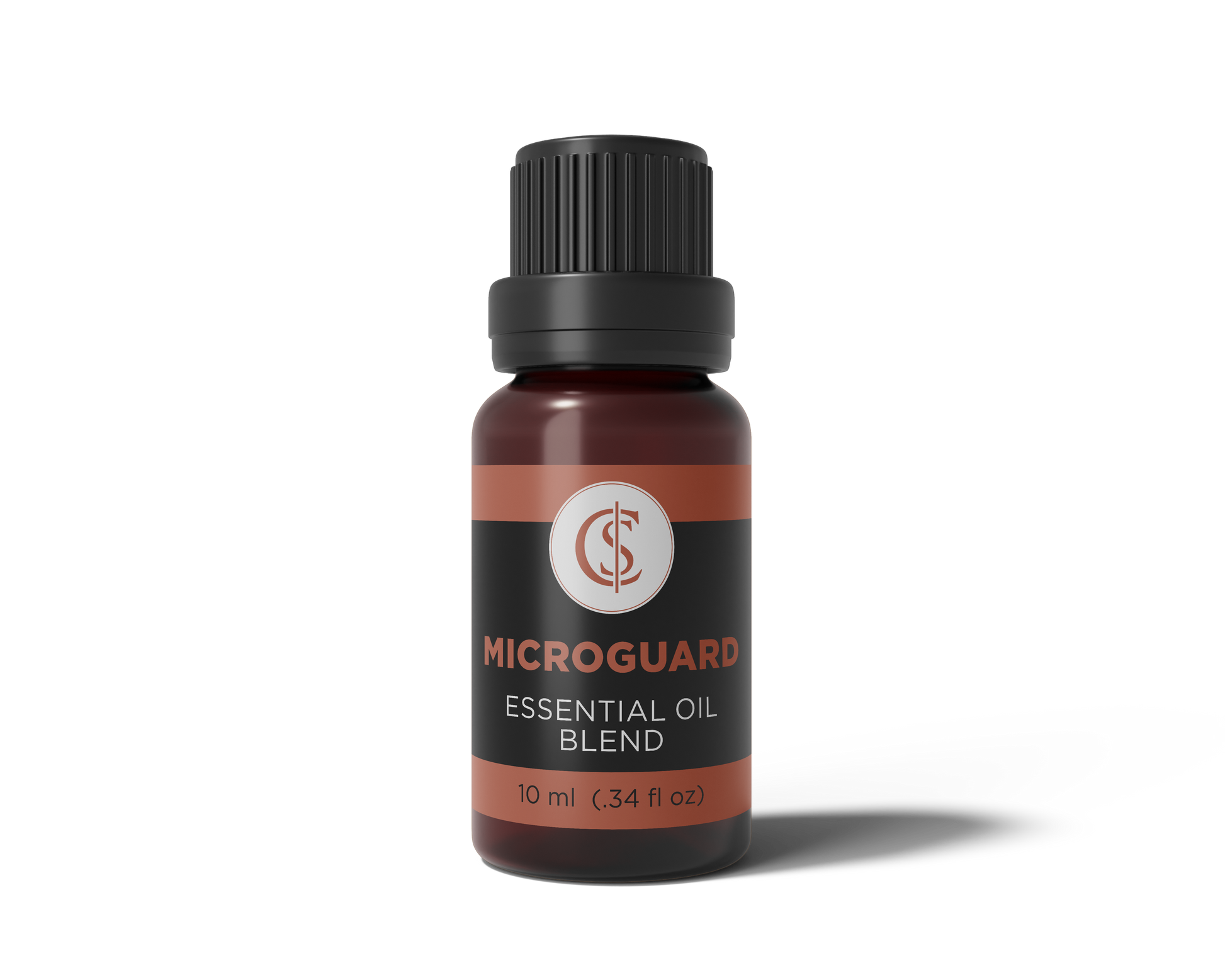 MicroGuard, an essential oil blend high in sabinene and thymol, can provide robust support for the immune system. These compounds possess antimicrobial properties helping combat harmful bacteria and promote overall immune function. MicroGuard can support respiratory health by aiding in clearing congestion and promoting easier breathing by loosening mucus and providing relief from respiratory discomfort. MicroGuard can help alleviate indigestion, bloating, and gas. MicroGuard can help combat acne-causing bacteria and soothe skin irritations. MicroGuard can contribute to oral health by helping combat harmful bacteria in the mouth and promote gum health. Dilute MicroGuard in water and use it as a mouthwash or add it to homemade toothpaste for added oral care benefits. Use MicroGuard to create a DIY cleaning solution for disinfecting surfaces and eliminating germs.