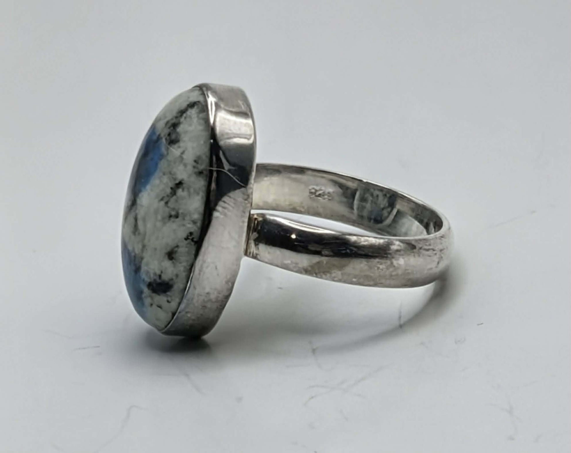 This Size 8 K2 Jasper ring is crafted in 925 sterling silver and features a natural stone sourced from the K2 mountains in Pakistan. The striking white granite is flecked with vivid blue azurite, creating a one-of-a-kind pattern. In metaphysical traditions, K2 Jasper is said to support clarity, focus, and connection to higher awareness, while the azurite inclusions are believed to encourage insight, intuition, and mindful intention. A unique and meaningful piece for anyone seeking to carry intention and balance in their daily life.